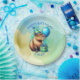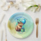 Blue and Green capybara themed boy's Birthday Party personalized paper plates. A watercolor capybara holding a balloon and birthday gift. Cute for kids of any age!