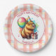 Adorable personalized capybara themed birthday party paper plates. A sweet watercolor capybara holding a balloon and birthday gift in pink and blue.
