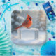 Un cardinal rouge vif se perche sur un bloc de glace transparent entouré de flocons de neige tombant doucement sur un fond d'hiver flou. Le texte sur le bloc de glace peut être modifié.