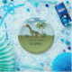 Illustration originale de Destei d'un mignon dinosaure de couleur verte Brachiosaurus debout dans un monde tropical comprenant un palmier, quelques plantes et de l'herbe verte. Le ciel est bleu avec quelques nuages dessus. Il y a aussi deux zones de texte personnalisables.