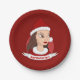 Plaques en papier avec l'illustration d'une jolie fille souriante avec de longs cheveux bruns ondulés, elle porte le costume et le casquette du Père Noël rouge et blanc ; conception de vacances de Noël avec un arrière - plan rouge, avec modèle texte personnalisable pour votre nom ou message