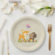 Plaques en papier avec une jolie illustration représentant un cerf de bébé et un petit écureuil tenant une glande et un papillon volant au-dessus de leur tête. Ces adorables créatures boisées se tiennent debout sur une herbe avec quelques champignons fantaisistes à leurs pieds. L'Arrière - plan a un look de papier kraft brun.