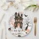 Perfectionnez pour Halloween ! Caractéristiques de conception ce mignonnes un motif orange et noir avec un avant et un centre hantés de maison, avec deux arbres nus de chaque côté. Un aboce de pleine lune, avec dire de fantôme HUENT, une batte, un cric o'lantern sur la pelouse et un chat noir tout s'ajoutent à l'ambiance de Halloween.