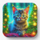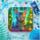 Cute chaton gris assis devant les assiettes en papier illuminées des arbres de Noël pour votre fête de Noël.