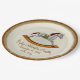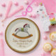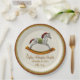 Cette plaque en papier présente la peinture numérique originale de Leslie Sigal Javorek d'un cheval rocking en or, argent et cuivre, 3 anneaux extérieurs pour correspondre et illusion de profondeur et de couleur de la porcelaine fine. 3 champs de texte pour le nom du bébé, la date de naissance et le poids.