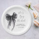 Élégantes assiettes en papier pour votre douche de mariée avec une aquarelle élégante d'un nœud coquet noir, "Elle noue le nœud" dans un script calligraphique, et le nom de la mariée et la date de la douche dans une écriture moderne simple.
