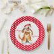 Carol peint de Noël moderne chantant des assiettes en papier festif de chien avec une bordure en pois rouge et blanc. Art original et design d'aquarelle par Sarah Trett.