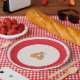 Christmas paper plate in white and red tones with a gingerbread house decoration
