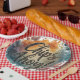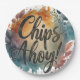 Les assiettes en papier présentent un design ludique, avec des puces de chocolat éparpillées et des miettes de biscuits contre un arrière - plan bleu clair. Le logo Chips Ahoy est imprimé au centre de l'assiette, et les bords sont décorés d'un motif répétitif de puces de chocolat et de miettes de biscuits. Les assiettes apportent une touche festive et amusante à toute fête ou événement.