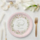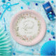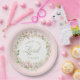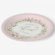 This plate has a wreath of pink flowers in a wreath with a pink striped background with text that says "Christ the Lord is Risen."