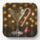 A martini glass filled with a clear cocktail and garnished with a Christmas candy cane is complemented by a small red ornament, all set against a backdrop of warm, golden bokeh lights