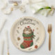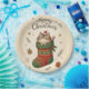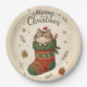 A festive illustration features a cute tabby cat wearing a Santa hat, nestled inside a green and red Christmas stocking. The stocking is decorated with traditional patterns. Above the cat, the words "Merry Christmas" are written in a decorative script. The background is a soft beige color, adorned with stars, dots, and sprigs of greenery.