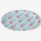 Pink Christmas flamingos wearing string lights and a Santa hat on a pastel blue background with snowflakes and festively decorated palm trees. Shown here on customizable paper party plates. You can easily resize the pattern to your preference and select your favorite background color. It's a cute pattern for celebrating Christmas with a tropical vibe!