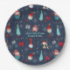 Add your family name and celebration date to these paper plates with whimsical holiday design featuring Santa cupcakes, snowmen, gift boxes, string lights, and snowflakes on a dark blue background.