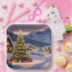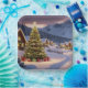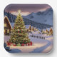 Serene Christmas holiday landscape scene with decorated Christmas tree in the midst of a village in early evening.