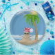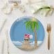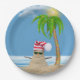 Sable bonhomme de neige avec casquette et lunettes de soleil rouge et blanc. Lumières de Noël sur palmier avec soleil brillant et arrière - plan de l'océan.