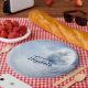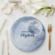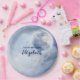 Assiettes en papier avec un ciel de fantaisie magique avec des nuages bleus duveteux et une grande lune magnifique. 2 cygnes blancs volant ensemble.