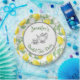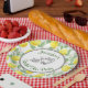 Plaque de papier conçue avec des citrons jaunes et des feuilles verts, dans un motif extensible. Au centre se trouve un cercle blanc avec une tasse de thé et une bouilloire. Personnalisez avec votre nom d'événement et le nom de l'invité d'honneur.
