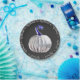 Un citrouille en verre transparent et argenté blanc avec une tige bleue est placé sur un arrière - plan gris et encadré d'un joli cadre à défilement floral en argent. Très jolie, très classe.