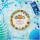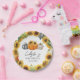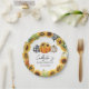Ce design présente trois citrouilles adorables en orange, noir et blanc plaid, et empreinte de léopard. La citrouille orange est agrémentée de jolis tournesols jaunes. Des tournesols et des citrouilles entourent le bord extérieur de l'assiette. Le nom de la mère enceinte dans une typographie cursive manuscrite est présenté avec "Baby Sprinkle" et la date.