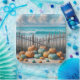 Une collection de citrouilles orange et turquoise sur une plage de sable encadrée par une barrière en bois patinée