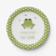Plaques en papier baby shower montrant une grenouille souriante, verte, aux coeurs verts. Les assiettes ont une bordure de coeurs blancs sur un arrière - plan vert. Les mots incluent un nom personnalisable.