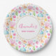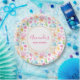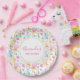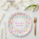 Plaques en papier de fête avec un délicieux et fantaisiste motif. Coeurs, lettres d'amour, muffins, tulipes et cerises apportent joie et bonheur à ce mignon petit motif. Jolies couleurs pastel. Un cercle blanc avec une fausse bordure en feuille d'or superposée avec votre texte à l'intérieur.