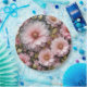 Fleurs cosmos roses délicates avec des pétales fins et translucides sont groupés ensemble, entourés de feuilles dorés sur noir