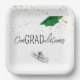 "ConGRADulations" en texte noir sur blanc avec des confettis d'or, un diplôme blanc, et un casquette de diplômé vert pour une fête de fin d'études 2025. La couleur arrière - plan peut être modifiée.