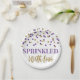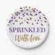 Saupoudrée d'assiettes d'amour pour bébés saupoudrées dans un motif de confettis violet et or.