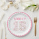 Cette plaque de 16 papier sucré présente le numéro 16 dans un motif rose de chalet rose avec Sweet dans une police de couleur rose. Il y a une bordure à pétoncles autour du bord.