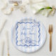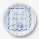 Coquillages bleu fraise banquette ondulée baby shower monogrammed papier plaques modèle, baby shower plaques personnalisées, croquis baby shower de plage imprimés plaques papier, baby shower d'été décoration de table personnalisée, coquillages sur la plage baby shower plaques papier, écriture manuscrite bleu rayures baby shower plaques personnalisées