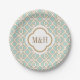 , Élégantes et belles les plaques à papier inspirées par tuile marocaine française élégantes avec un motif géométrique de répétition de quatrefoil de bleu verdâtre et d'or de coquille d'oeuf conçoivent. Nos plaques à papier faites sur commande de sembler classieux et luxe peuvent être décorées d'un monogramme avec les initiales des jeunes mariés ou des couples de célébration et sont parfaites pour un Marocain formel, un mariage orienté de mille et une nuits inspirés et d'Indien ou d'Aladdin, une douche de couples, une douche nuptiale, une fête d'anniversaire ou une célébration de fiançailles. © Chrissy H. Studios, LLC de conception. Tous droits réservés