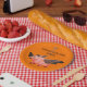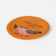 Un cochon en suspension, mignon et farci, vêtu d'un costume de corbeau semble voler. Le cochon est rose et habillé d'un bec jaune et d'ailes en plumes noires. L'assiette est faite en orange et noir et peut être personnalisée. Très mignon.