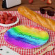 De belles couleurs arc-en-ciel et des coeurs avec les mots Just Married et les noms du couple nouvellement marié et leur date mariage.