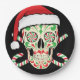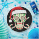 Un crâne orienté de sucre de Noël avec un casquette de Père Noël, des yeux de menthe poivrée et des os croisés de sucre de canne sur un arrière - plan noir.