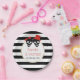 Crânes modernes et rayures blanches noires rouge Halloween plaque de papier mariage. Il présente un motif rayé noir et blanc, un cercle blanc au centre avec votre texte et un couple crânien amusant en rouge et noir la mariée avec un arc, le marié avec un casquette.