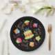 Célébrez un anniversaire spécial avec ces assiettes amusantes et pleines de fantaisie. L'art éblouissant présente un gâteau d'anniversaire avec des bougies entourées de cupcakes, des mots fantaisistes "Joyeux anniversaire", des points et des serpentins qui apparaissent sur un arrière - plan noir. Cet art original est de la créatrice de tissus Phyllis Dobbs. Les autres couleurs sont le rouge, le rose, le jaune, l'orange et le vert. Coordonner avec des autocollants et d'autres produits pour une fête d'anniversaire heureuse, surtout pour quelqu'un au-dessus de la colline!