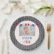 Cute Baseball Chalkboard 1er Anniversaire Plaques de fête avec une Photo / Cute anniversaire de fête pour une 1ère fête avec une photo personnalisée. Le design est composé d'un baseball et de drapeaux de bunting aux couleurs rouge, blanc et bleu. L'arrière - plan a un motif de baseball sur un tableau de baseball. Personnalisez cette serviette de fête d'anniversaire avec la photo d'un enfant - insérez votre photo dans le modèle.