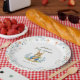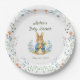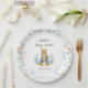 Set a lovely table to celebrate the upcoming arrival of your little one with this classic storybook-inspired baby shower paper plate. Featuring a charming, watercolor style bunny holding a carrot, this design is framed by hand painted delicate blue ribbons, whimsical bows, and soft garden florals.