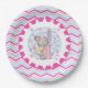 Cute Mouse 4e anniversaire plaques de papier de fête comprend une souris grise dans une robe de soirée à pois jaunes et un casquette de soirée en vichy rose, un ballon d'anniversaire à pois lavande, un grand numéro rayé 4, étoiles, tourbillons, et des rayures de chevrons rose chaud, rose clair, bleu et blanc! Ces plaques de papier pour le quatrième anniversaire de la souris seront certainement un succès à toute célébration de 4ème anniversaire!