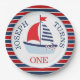 Thème nautique du mignon garçon 1er anniversaire plaques personnalisées en papier avec voilier, sur un cadre blanc et arrière - plan rayé marine et rouge. Personnalisez le texte vous-même lorsque vous commandez. Plaques de papier amusant pour anniversaire de thème nautique.