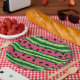 Plaques en papier avec un motif de pastèque mignon. Croûte verte en couches de rayures avec une couche de rayures roses avec des graines noires à l'intérieur. Amusement et design estival.