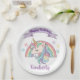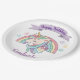 Ces assiettes personnalisées mignonnes et colorées présentent une belle illustration d'un arc-en-ciel couleur unicorne et pastel. De petites étoiles aux couleurs assorties entourent l'arc-en-ciel. Un exemple de bannière Joyeux Anniversaire est imprimé au-dessus de la licorne, et un exemple de nom est imprimé ci-dessous dans une police de caractères violets élégante. Vous pouvez personnaliser les plaques pour inclure votre propre nom ou texte personnalisé.