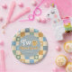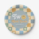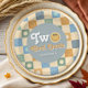 This groovy boys 2nd birthday paper plate design captures 70s vibes with a blue pastel chequered border. Fully customizable, it includes space for a name in a retro script. Perfect for a cute "Two cool dude" boho birthday, this playful blue smile design adds charm to your little one's special day!