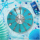Il est temps de manger ! Un visage d'horloge bleu et aqua fait à partir de cuillères et fourches. C'est génial pour une assiette géniale ! Voyez que c'est une image de soeur rouge et rose 'Cutlery O'clock 2.'