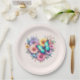 Paper plates with a beautiful illustration. A heart-shaped bouquet of flowers in pastel blue, green, purple and yellow. With a lovely blue butterfly hovering in front.
