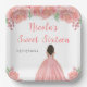 This sweet sixteen plate features faux glitter pink floral flowers and a beautiful princess with dark skin and an elegant dress. This is perfect for a sweet sixteen birthday party.