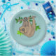 Un joli dessin d'un paresseux brun accroché à une branche avec des feuilles, accroché à l'envers. Arrière - plan vert rétro.