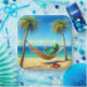 Grand cornichon vert se relaxant dans un hamac avec un cocktail tropical accroché entre deux palmiers tropicaux sur une plage aux tongs.